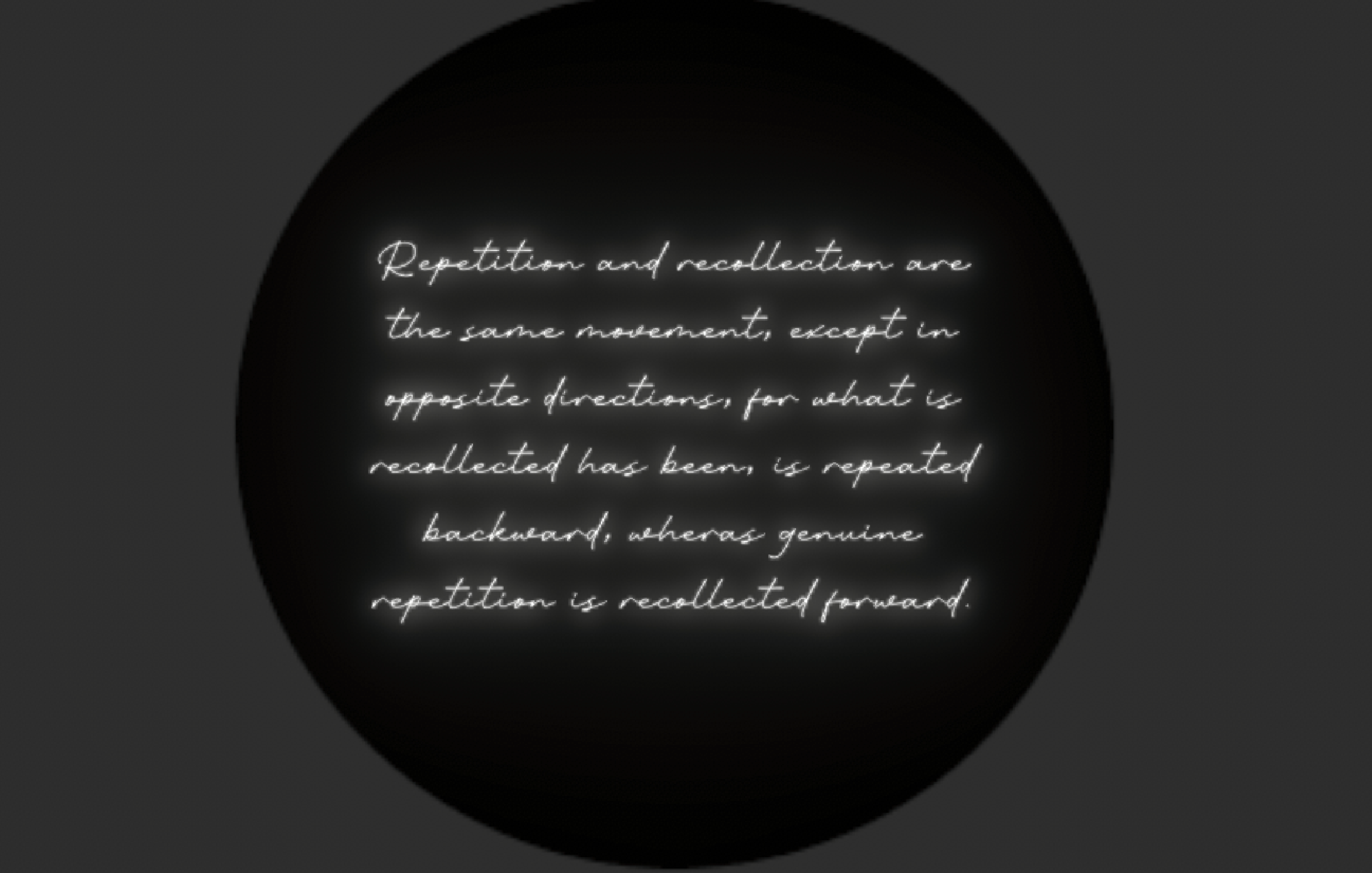 It is a minimal, contemplative, alt.ctrl game where players use a hand-made, synth-like controller to find the correct locations for on-screen pixels. Subtle visual and sonic cues help to guide the player. As these pixels are moved to their correct locations, they create unique constellations. The creation of these constellations resolves obfuscated abstract content on the screen, revealing texts from Søren Kierkegaard's essay Repetition. Once the image is fully uncovered, the player is given the opportunity to read the text before the whole image shrinks back down to the single white dot, offering them the opportunity to undergo the activity again. Through this repetitive act of finding, listening, observing, and reflecting, the player is invited into a more contemplative form of play, a play that is guided by them, where there is no discrete ending or win-state.